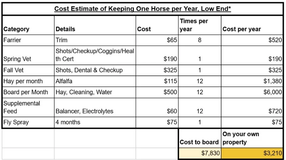 *Disclaimer on these estimates: These are the very bare minimum of costs and assuming that you already have grooming supplies, tack, panels, trailer, truck and other horsey infrastructure. It also does not account for paying for training, lessons nor clinics.